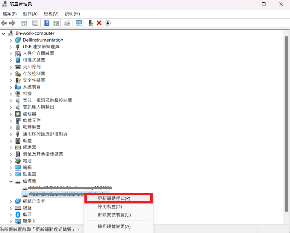- 點開「磁碟區」的選單,對每個磁碟按右鍵「更新驅動程式」